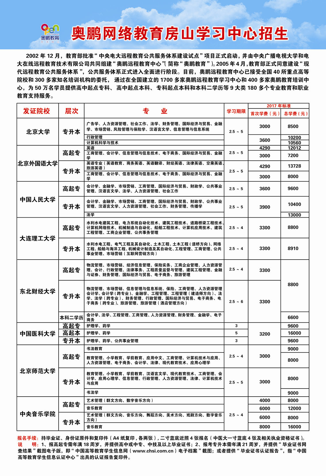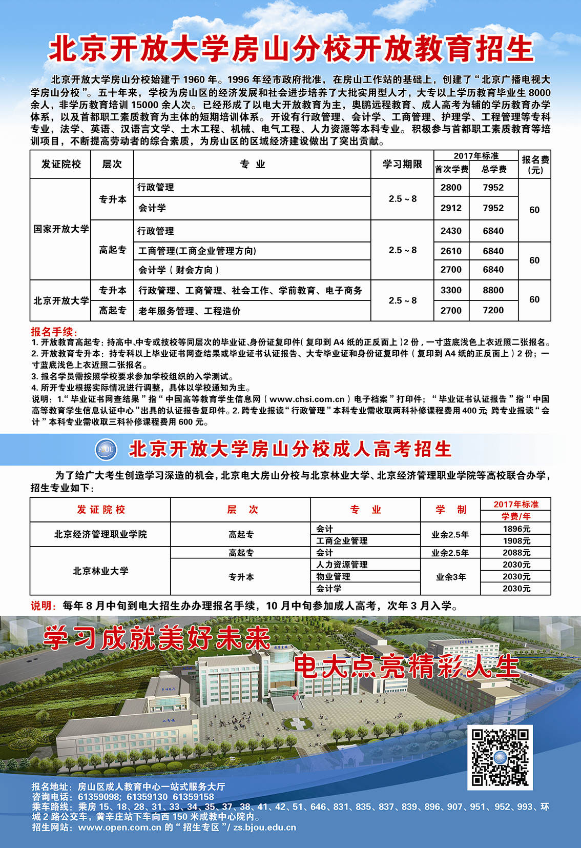 请您携带个人身份件,学历证书和团区委推荐表(团区委推荐表到报名大厅领取)在房山区成人教育中心一站式招生服务大厅报名。